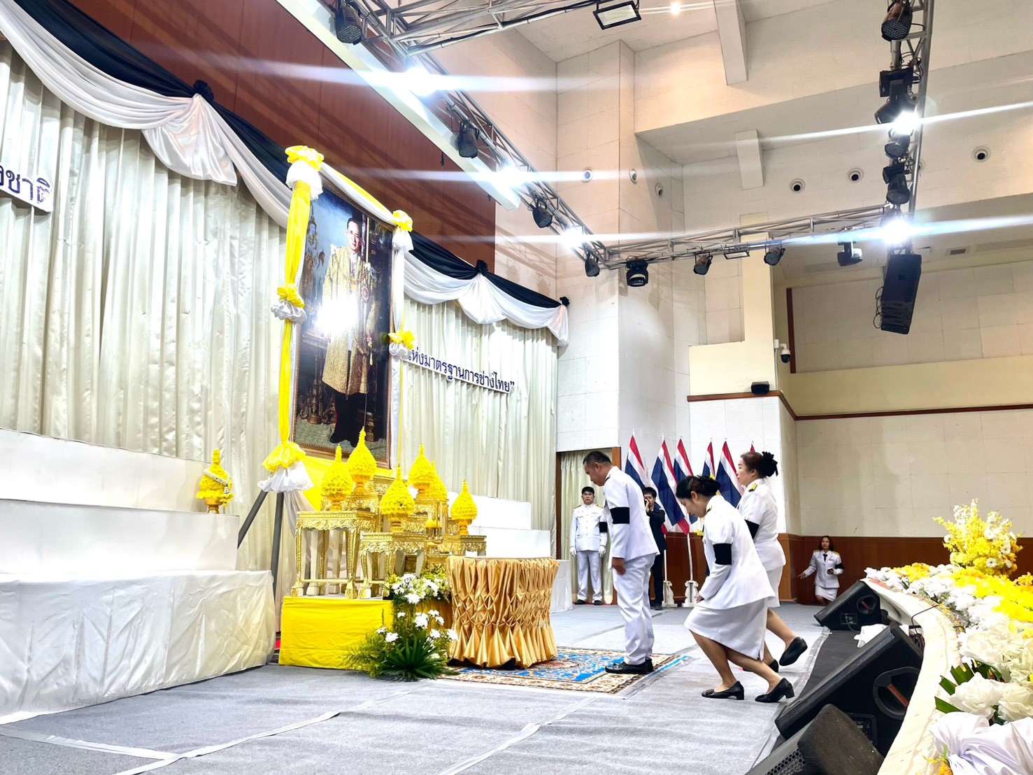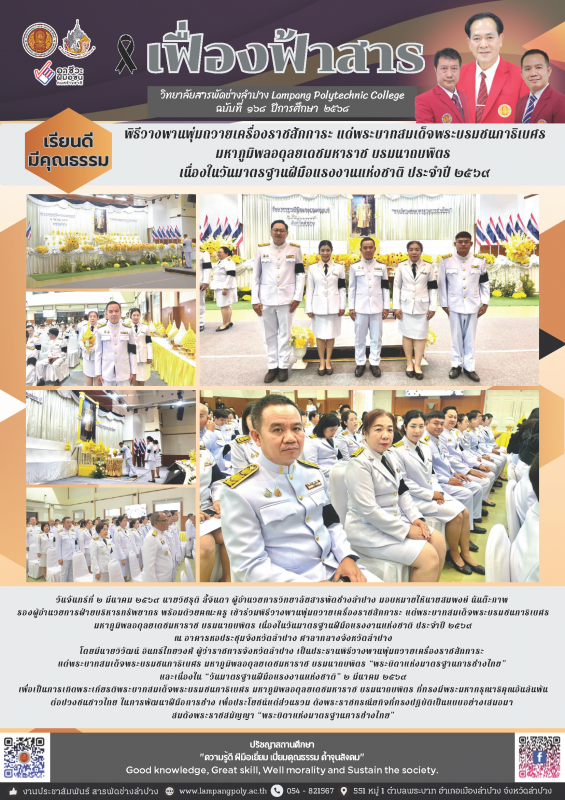 วันจันทร์ที่ 2 มีนาคม 2569 เวลา 07.00 น. นายวิชรุติ ลี้จินดา ผู้อำนวยการวิทยาลัยสารพัดช่างลำปาง มอบหมายให้นายสมพงษ์ นันต๊ะภาพ รองผู้อำนวยการฝ่ายแผนงานและความร่วมมือ พร้อมด้วยคณะครู เข้าร่วมพิธีวางพานพุ่มถวายเครื่องราชสักการะ แด่พระบาทสมเด็จพระบรมชนกาธิเบศร มหาภูมิพลอดุลยเดชมหาราช บรมนาถบพิตร เนื่องในวันมาตรฐานฝีมือแรงงานแห่งชาติ ประจำปี 2569